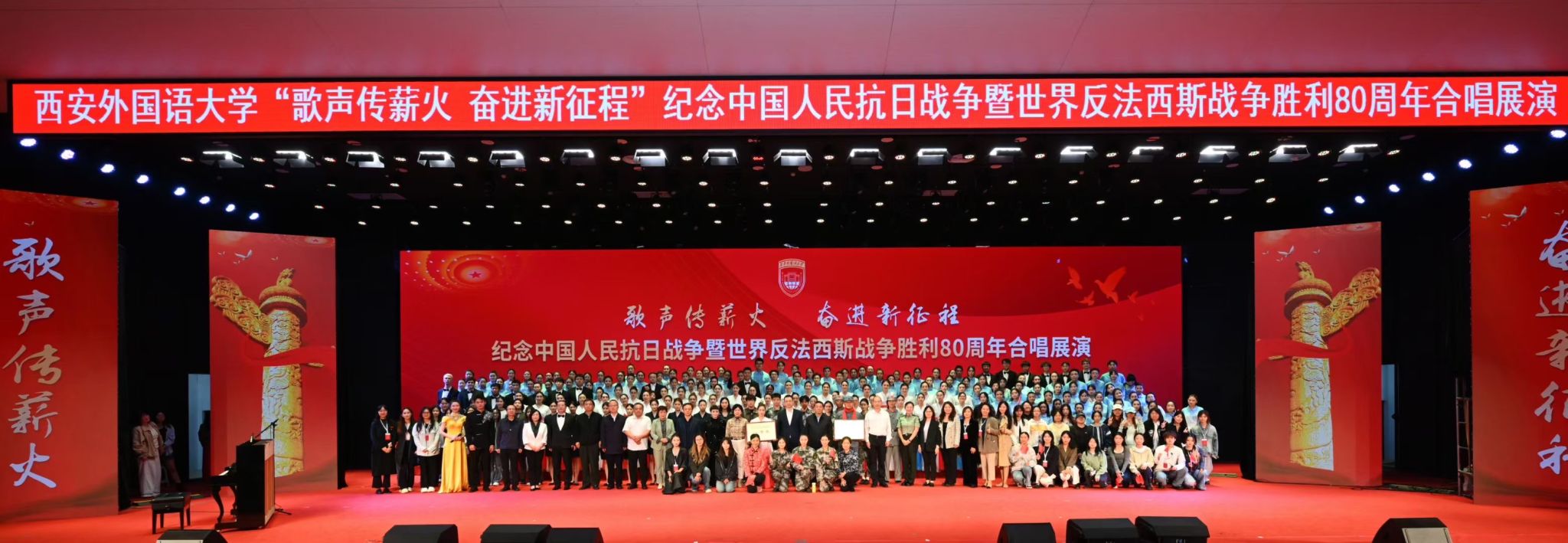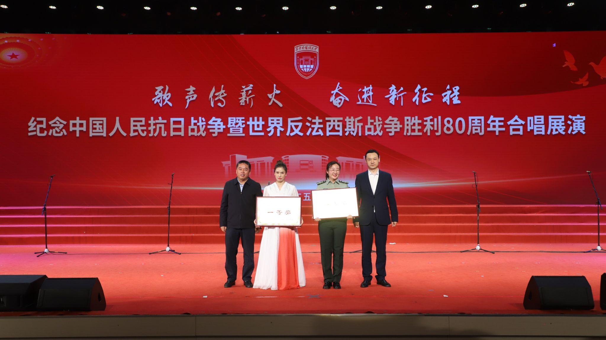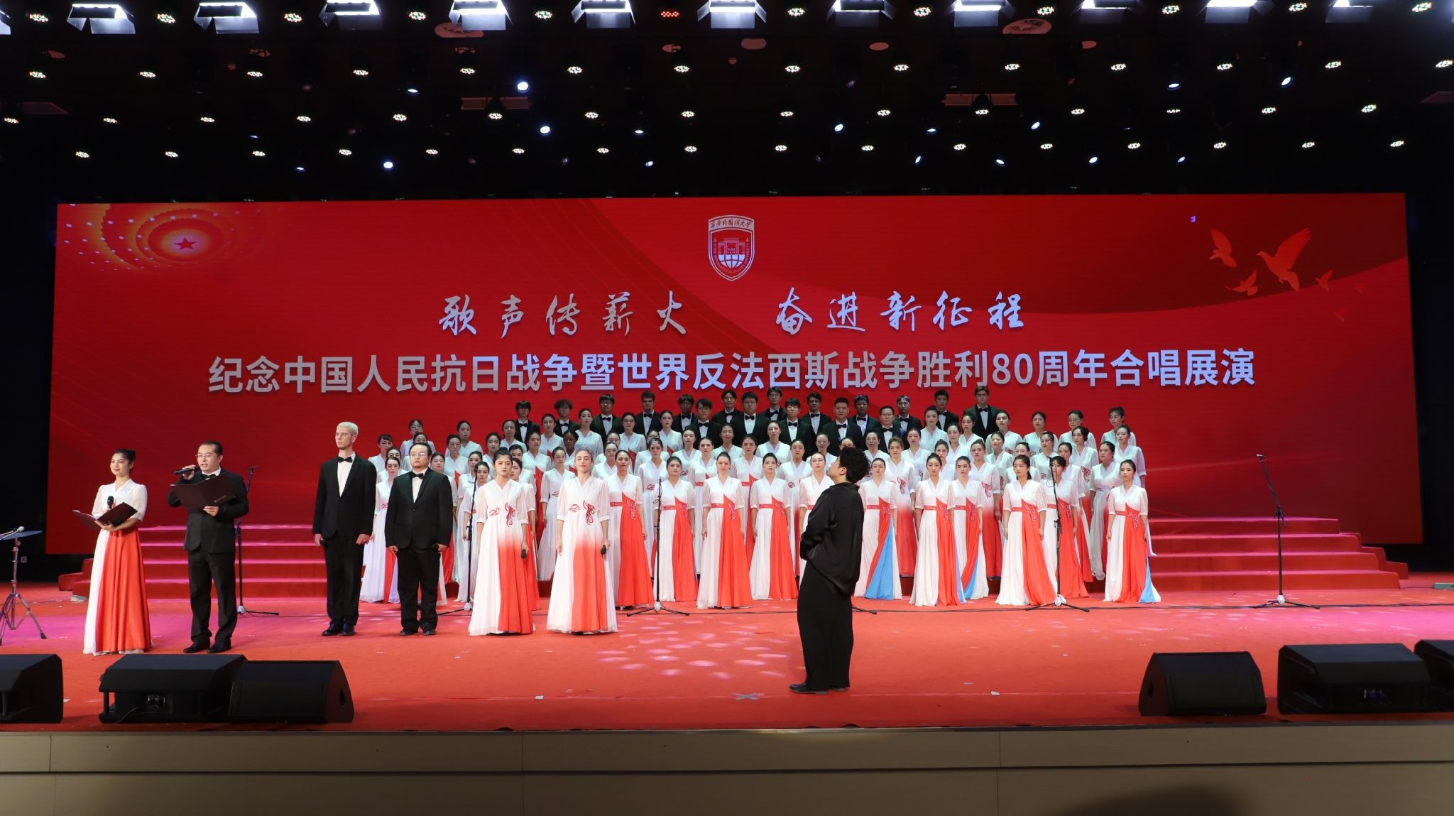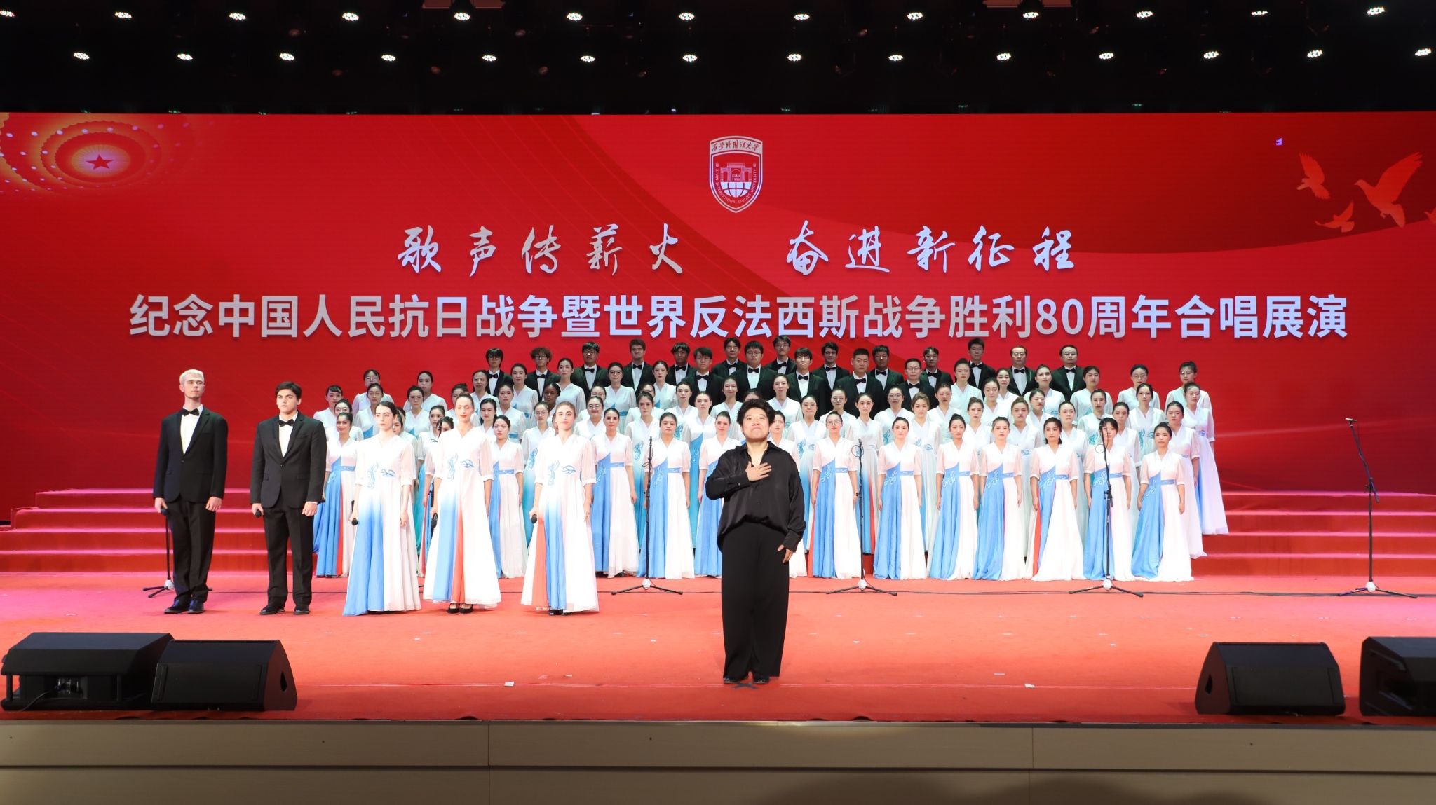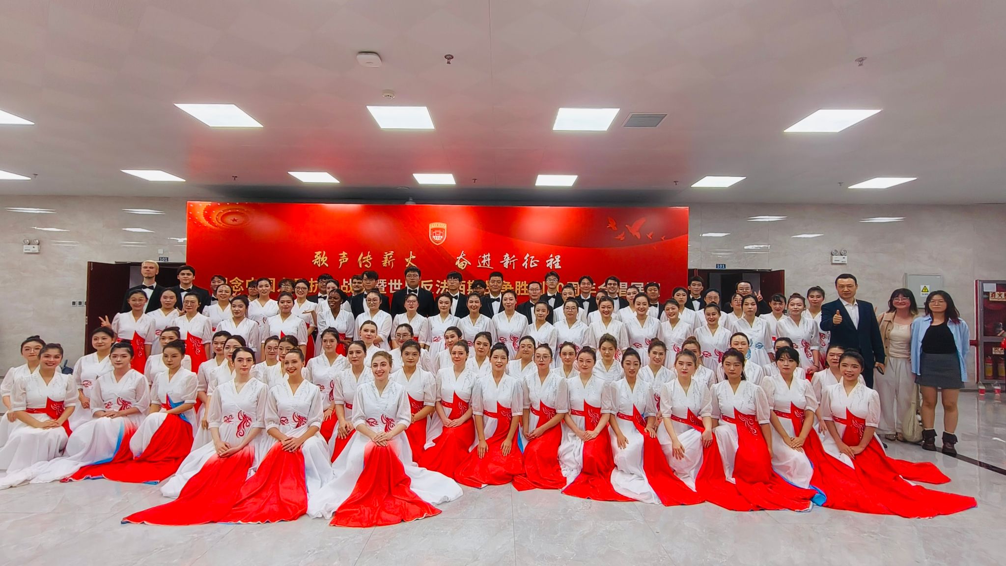 歌声传薪火,奋进新征程。9月27日晚,我校纪念中国人民抗日战争暨世界反法西斯战争胜利80周年合唱展演于启智楼圆满举行。我院中外学子与教师代表组成的合唱团,以饱含深情地演绎、默契的配合惊艳全场,从多支参赛队伍中脱颖而出,一举斩获一等奖。