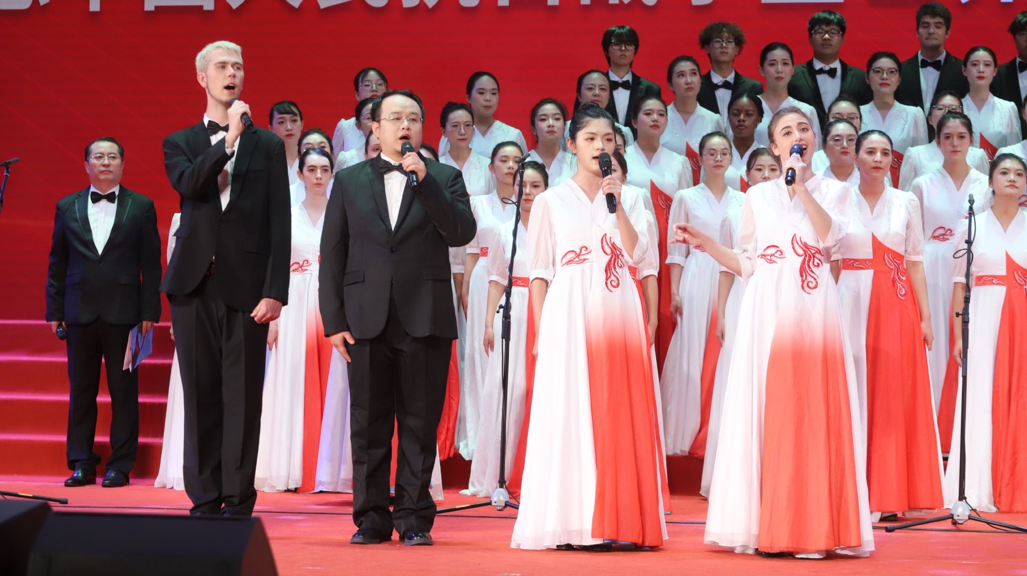 我院合唱团由16名教职工、48名中国学生和21名国际学生组成。副校长桑元峰参加我院合唱团并与塔吉克斯坦学生米娜共同朗诵。合唱团85名成员身着统一服饰,以挺拔的身姿站上舞台,以一曲《国际歌》开篇,斗志激昂的旋律骤然响起,成员们眼神坚定、歌声嘹亮,展现出跨越国界的精神共鸣。紧接着,在《我爱你中国》婉转悠扬的旋律中,多声部交织如溪流汇聚,流淌出对中国的热爱,情真意挚的演唱感动着在场的每一个人。