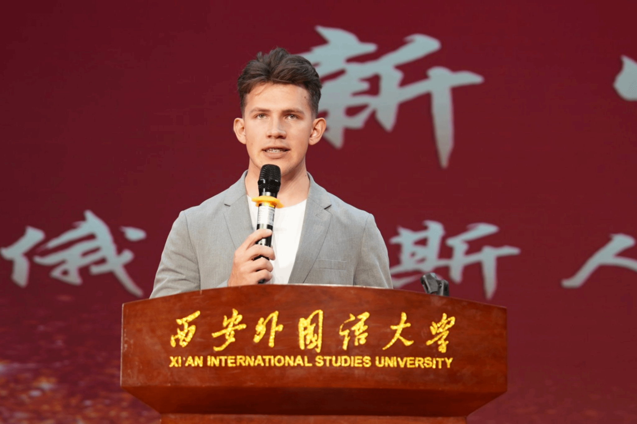 俄罗斯人民友谊大学交换生谢友哲作为国际新生代表发言,提及其因中国历史文化、发展及中俄紧密关系选择中国区域研究专业。他愿以中文促进中俄贸易合作与交流,鼓励学院留学生在中外交流的过程中注入自己的青春力量。