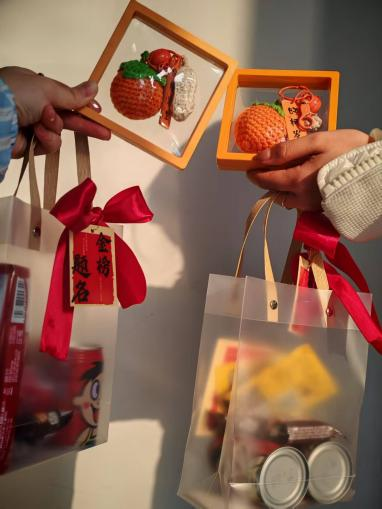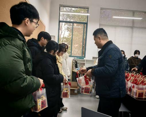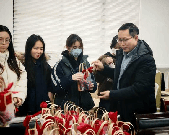 师长们的寄语结束后,学院领导亲手将一份份寓意美好的“考研加油包”送到同学们手中。同学们接过礼物,仔细端详着每一样物品:咖啡是冲刺阶段的精力补给,小零食是学院对日常备考的贴心关怀。每份礼包里还附有一张祝福卡:“愿所有努力都不被辜负”“坚持到底,好事定会发生”……字字句句,温暖人心。一位收到礼物的同学感动地说:“学院太用心了,连礼物都准备得这么有寓意。‘好事发生’这个挂件,我会一直带在身边。”