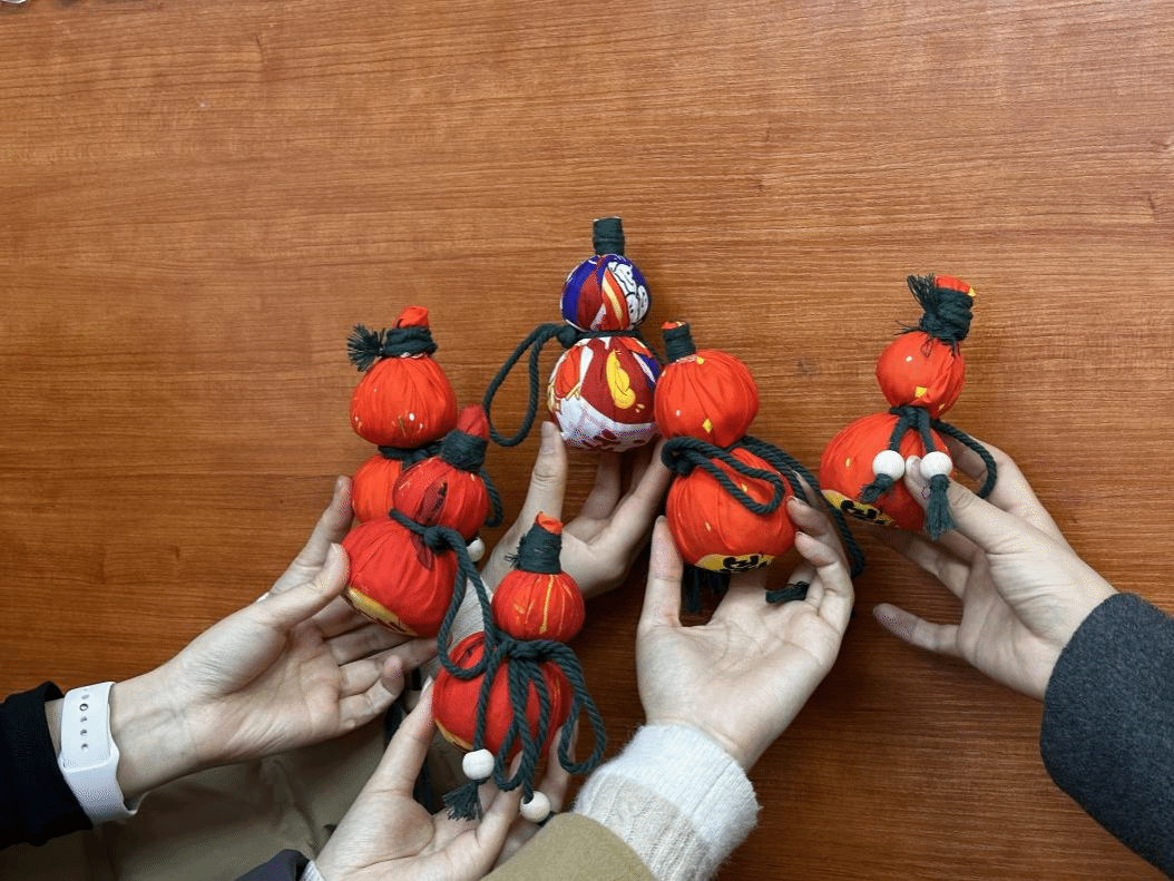 活动伊始,先对葫芦香囊的文化寓意进行了介绍:葫芦谐音 “福禄”,内置的艾草这一天然香料有驱虫避秽、祈福安康的功用,是中华非遗文化的生动载体。随后,大家分步骤学习了布料粘贴、内置填充、捏造塑形、系绳装饰等制作工序,认真学习制作技巧与造型要点。