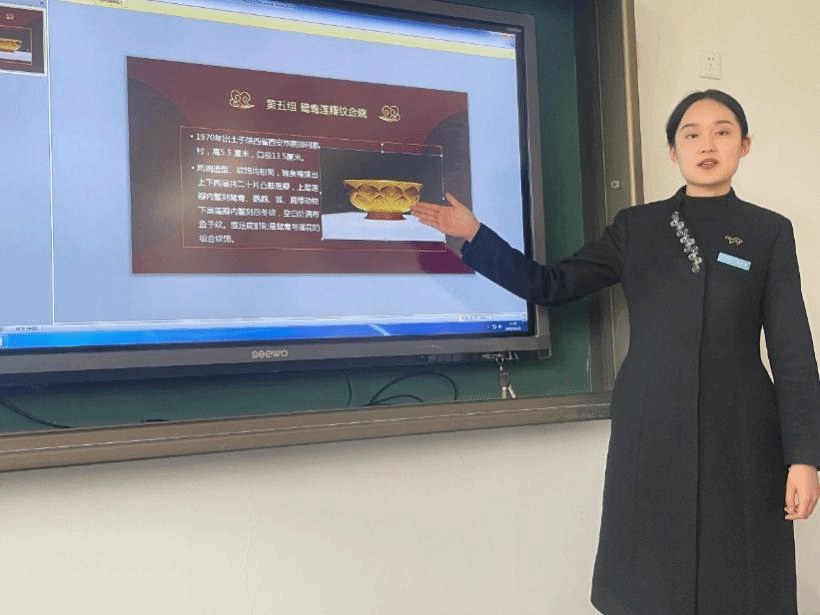 中场休息时间,张誉婷老师对“鸳鸯莲瓣纹金碗”这件文物展开了一分钟的英文讲解,不仅让我们看到了专业讲解员的知识储备能力和素质水平,也为同学们的后续讲解、演讲等场合提供借鉴。