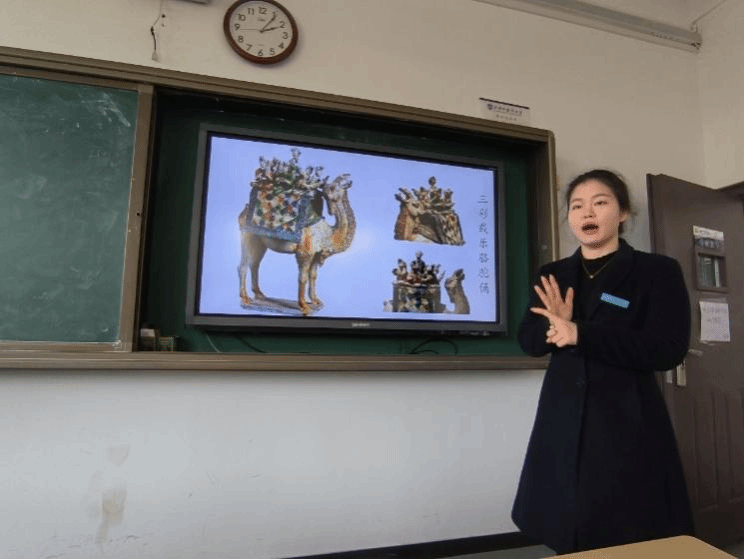 11月14日,陕西历史博物馆的专业讲解员为学生们介绍了讲解的标准手势、站位选择以及走位方式等。高静怡老师一边纠正同学们的手势和走位,一边指出,讲解员的手势要与展品保持平行,手臂随着讲解的位置自然移动,走位时要始终面对游客等。