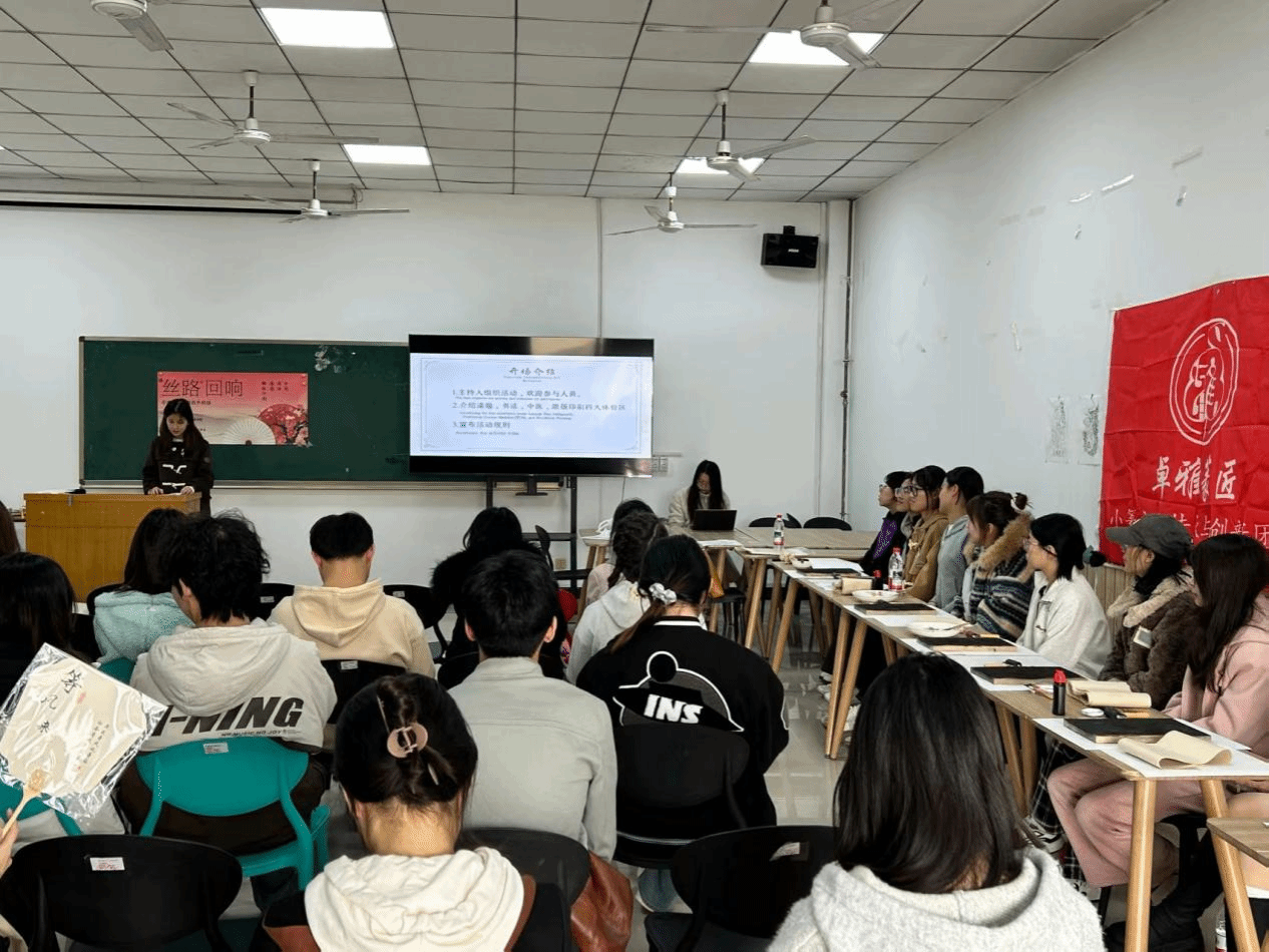 为弘扬中华优秀传统文化,促进中外学生交流互动,西安外国语大学汉学院丝路汉语客社团于2025年11月13日14:00至17;00,在校内大学生活动中心302,303宣讲室开展“丝路回响—非遗之光照亮西外校园”活动。本次活动特邀卓雅篆匠团队、雅宣阁社团共同参与,并得到“丝路岐黄传薪火;中亚留学生中医文化传播者培育计划”项目的大力支持。活动覆盖做漆扇、写书法、体验中医按摩,拓印传统版画四大板块,吸引了众多中国学生与留学生共同参与,现场氛围热烈,中华文化气息浓厚。