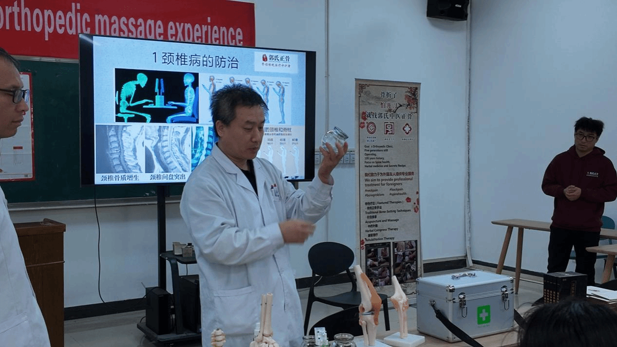 随后进入各个展区的体验环节,中医按摩展区是本次活动的一大亮点。作为丝路岐黄传薪火项目的重要实践环节,社团特邀中医师现场展示针灸,颈椎按摩与拔罐等传统疗法,讲解中医理论与养生知识。现场参与的同学对此展现出浓厚兴趣,纷纷上前体验,感受中医文化的博大精深。
