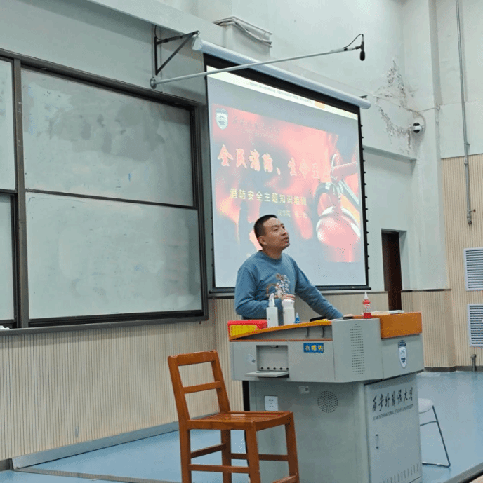 讲座中,保卫处赵鹏辉系统讲解了校园防火要点及初起火灾的应对流程,重点介绍了灭火器的使用方法,强调了规范用电的重要性,并详细说明了火灾发生时的正确应对措施。
