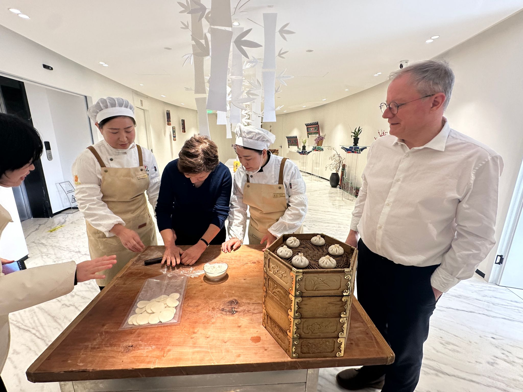 11月19日上午,代表团在西安外国语大学长安校区参加了孔子学院理事会,就中法语言教学与文化交流合作进行了深入探讨。会后,代表团走访了具有浓郁民族特色的回民街,并在贾三灌汤包总店品尝西安特色美食。下午,代表团登上西安古城墙,俯瞰古都风貌,感受历史与现代的交融。